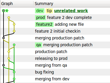 Production patches would happen in the prod branch and then get merged back down the pipeline. It looks something like this diagram.
